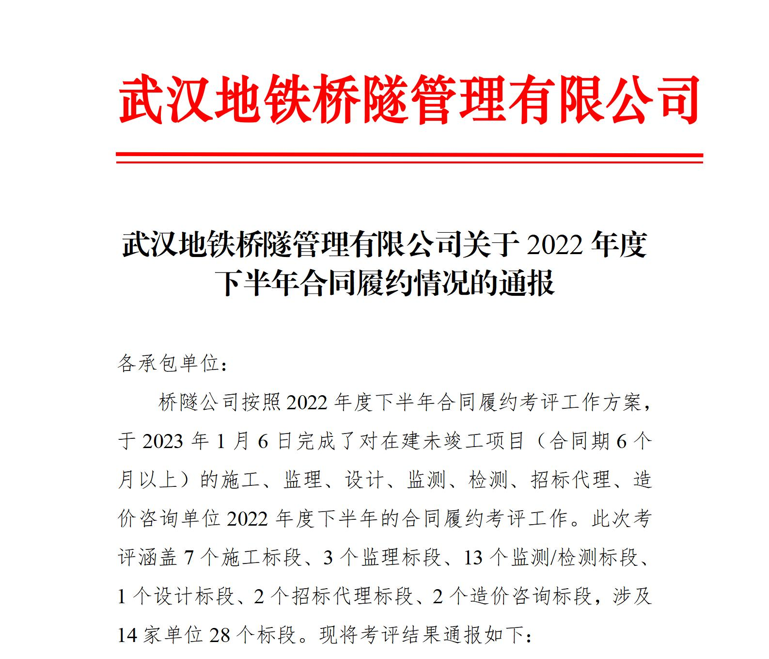 近日,在武汉地铁桥隧公司对2022年度招标代理单位合同履约情况的考评中,suncitygroup太阳新城公司喜获优秀等次。