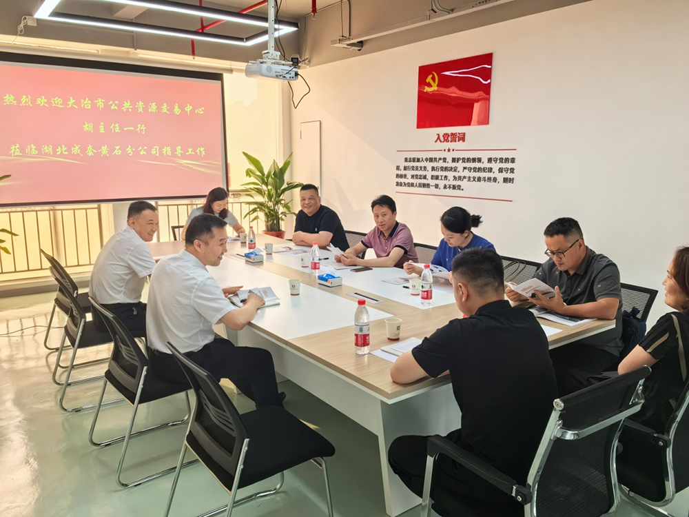 近日,大冶市公共资源交易中心(政府采购中心)党组书记、主任胡耀中携领导班子全体成员到suncitygroup太阳新城黄石分公司调研(以下简称“黄石分公司”)。