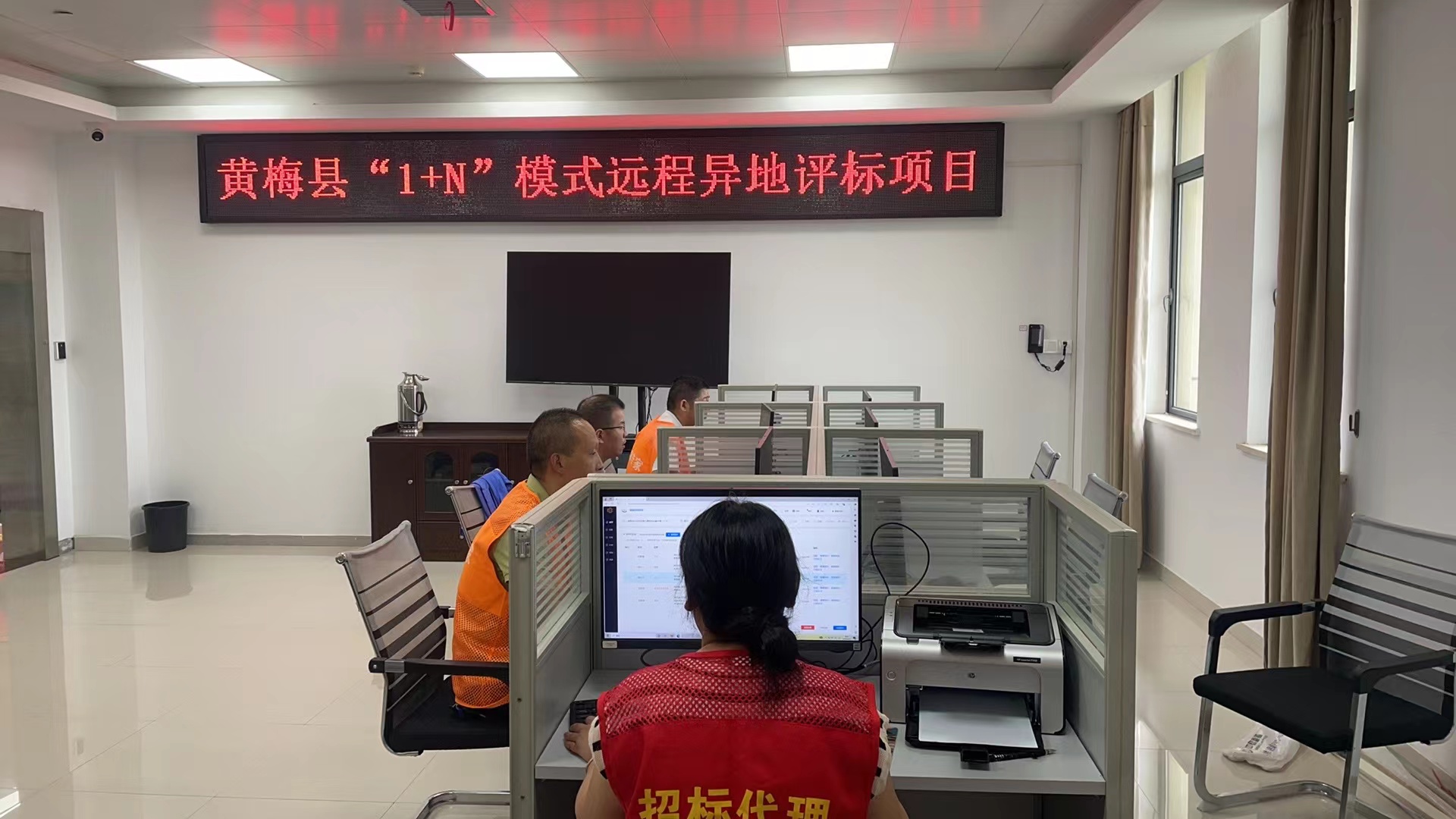 “1+N”多地评审模式是指1个主场和N个客场,身处不同地域的评审专家通过在线评标系统,以远程视频、语音交互方式实现无障碍化在线沟通,在线同步评审,在线打分,评标结果由所有会场的专家共同进行确认。