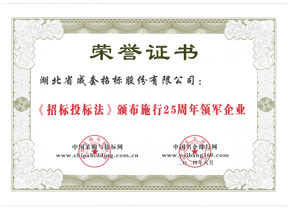 公司还同时获得2024年“湖北省招标代理机构前三强”“招标代理行业综合实力百强”“工程造价咨询行业综合实力百强”“《招标投标法》颁布施行 25 周年招标代理行业公益奖”四项荣誉。