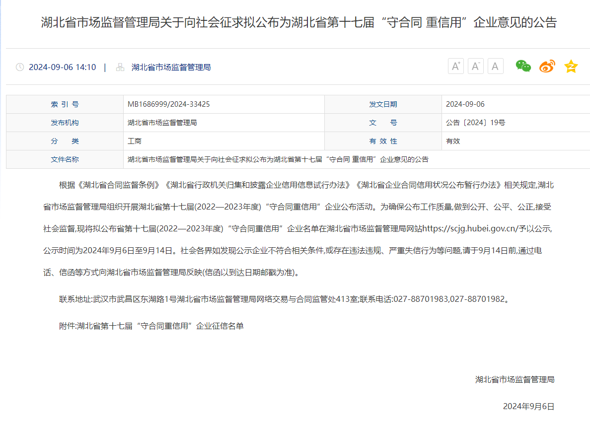 公司下属子公司湖北省suncitygroup太阳新城造价咨询有限公司在此次评选中荣获2022—2023年度湖北省和武汉市“守合同重信用”企业称号。湖北省suncitygroup太阳新城工程咨询有限公司荣获2022-2023年度武汉市“守合同重信用”企业称号。